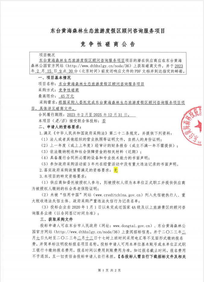 3、竞争性磋商公告+文件--东台黄海森林生态旅游度假区顾问咨询服务项目(不见面).doc