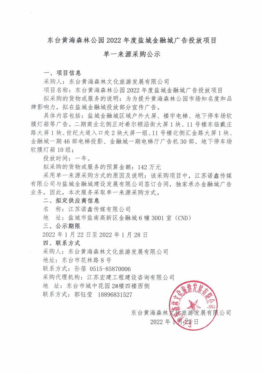东台黄海森林公园2022年度盐城金融城广告投放项目单一来源采购公示